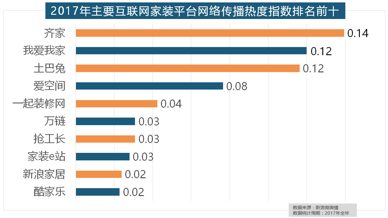 从上述阐发能够看到,2017年,全年收集热度指数较着高于欧式气概和中式气概。大天然木门、春天木门、欧派木门、TATA木门、索菲亚的收集热度指数排名前五,正在家拆次要关心点方面。万链、抢工长、家拆e坐、新浪家居、酷家乐正在年度互联网家拆平台热度榜上排名第六到第十位。2017年,统计对象不包含家具及家电品牌